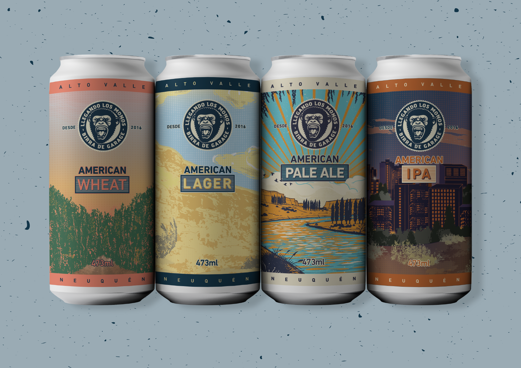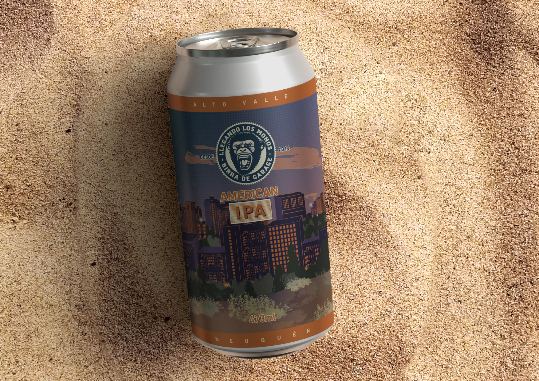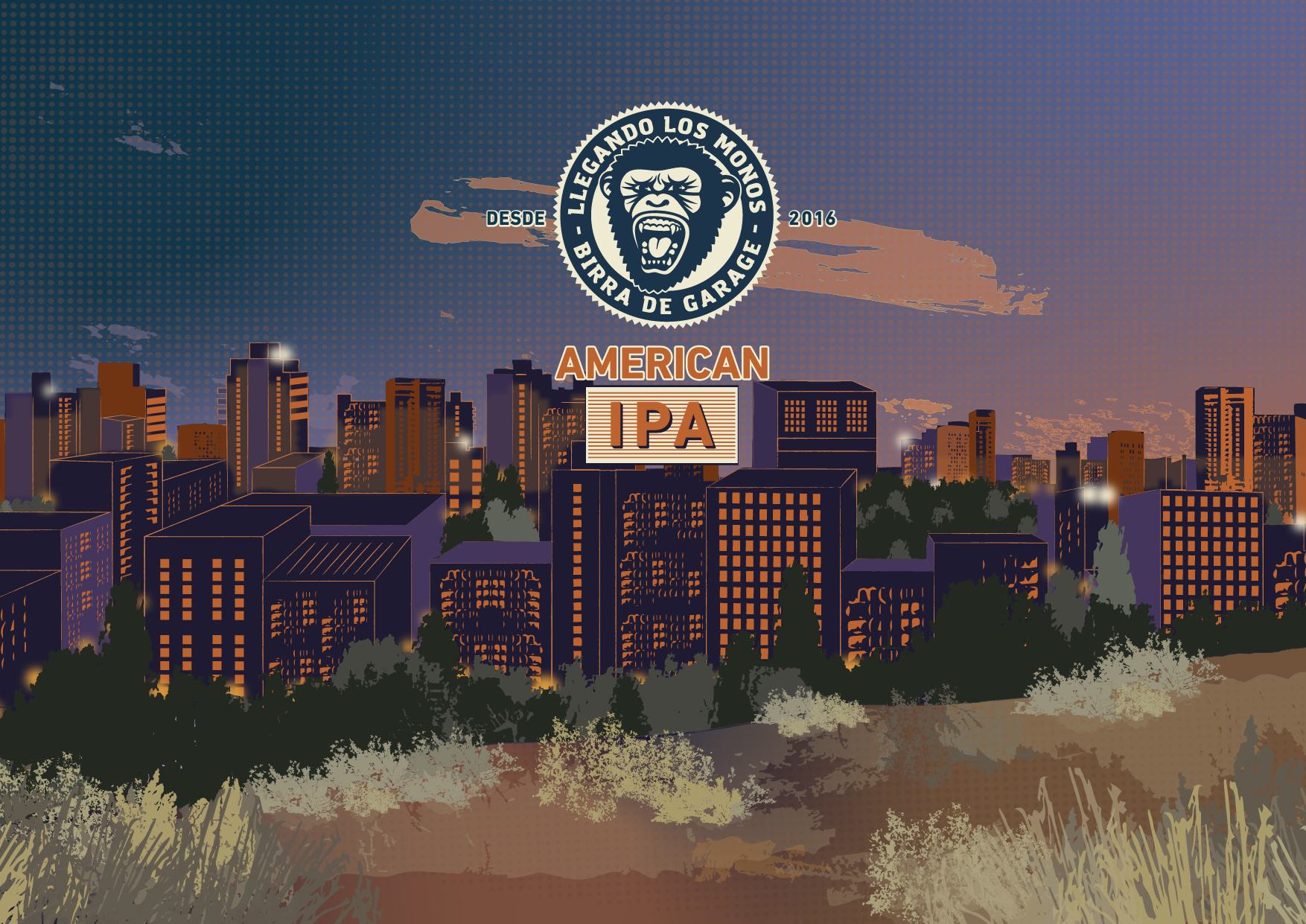 Continuando con la serie de paisajes neuquinos para las etiquetas de Llegando los Monos®, en el caso de la American Ipa se pensó en un escenario nocturno o transicionando a. Se buscó que el naranja (uno de sus colores marcarios) sea color predominante. En contraposición, el clásico azul de los monos.