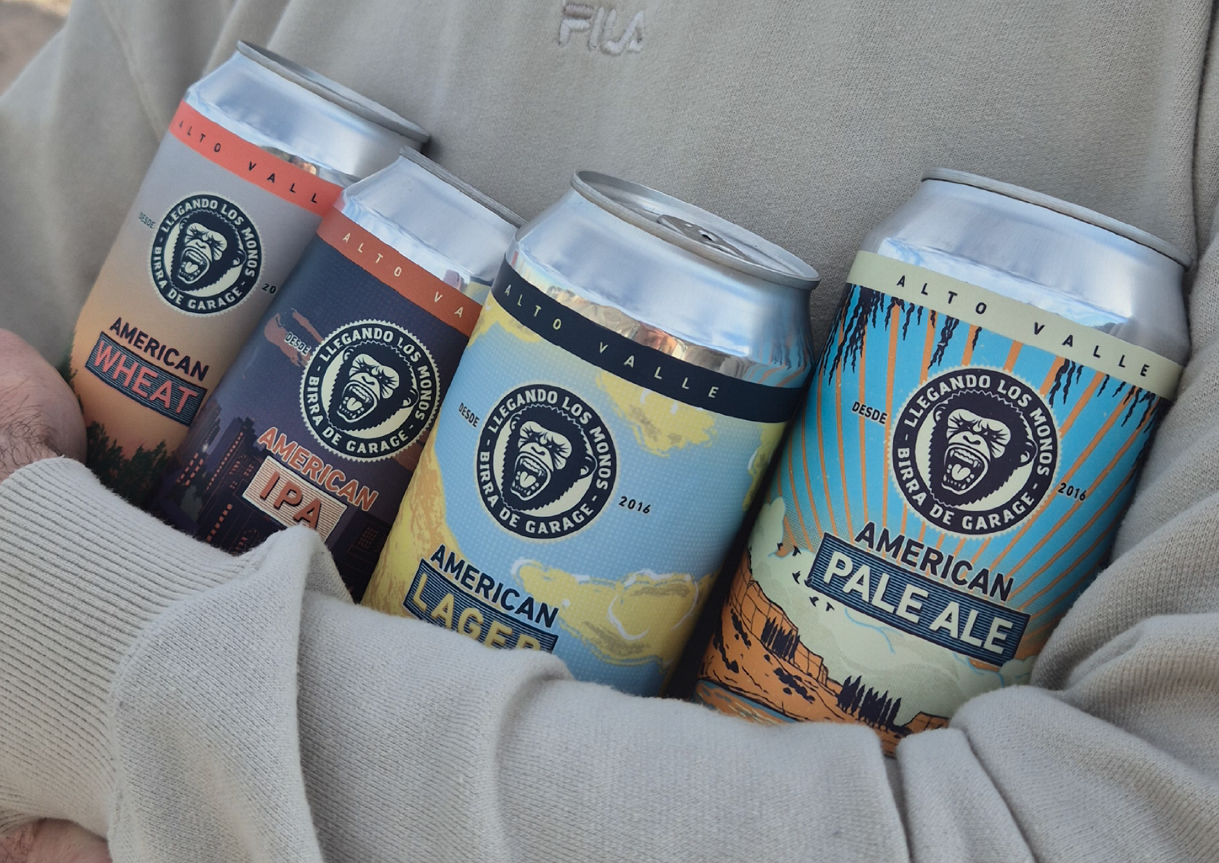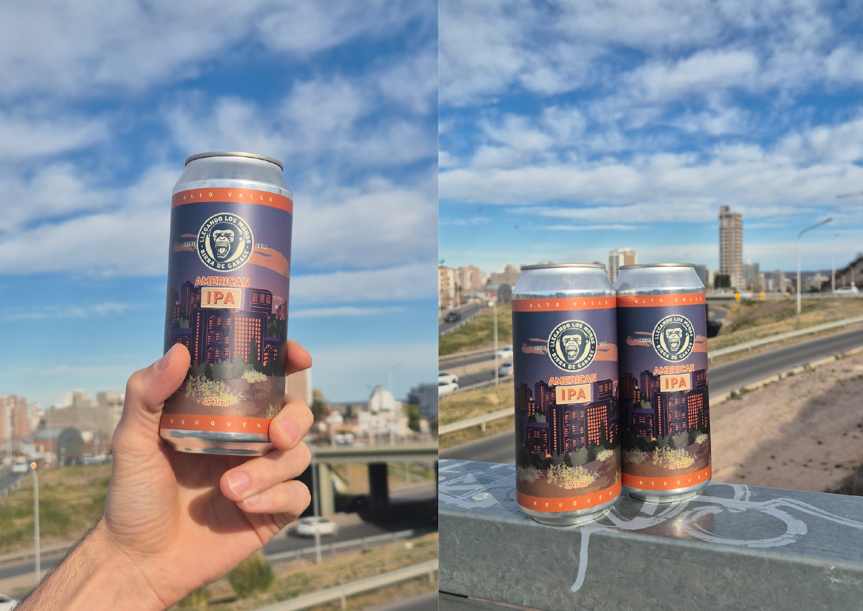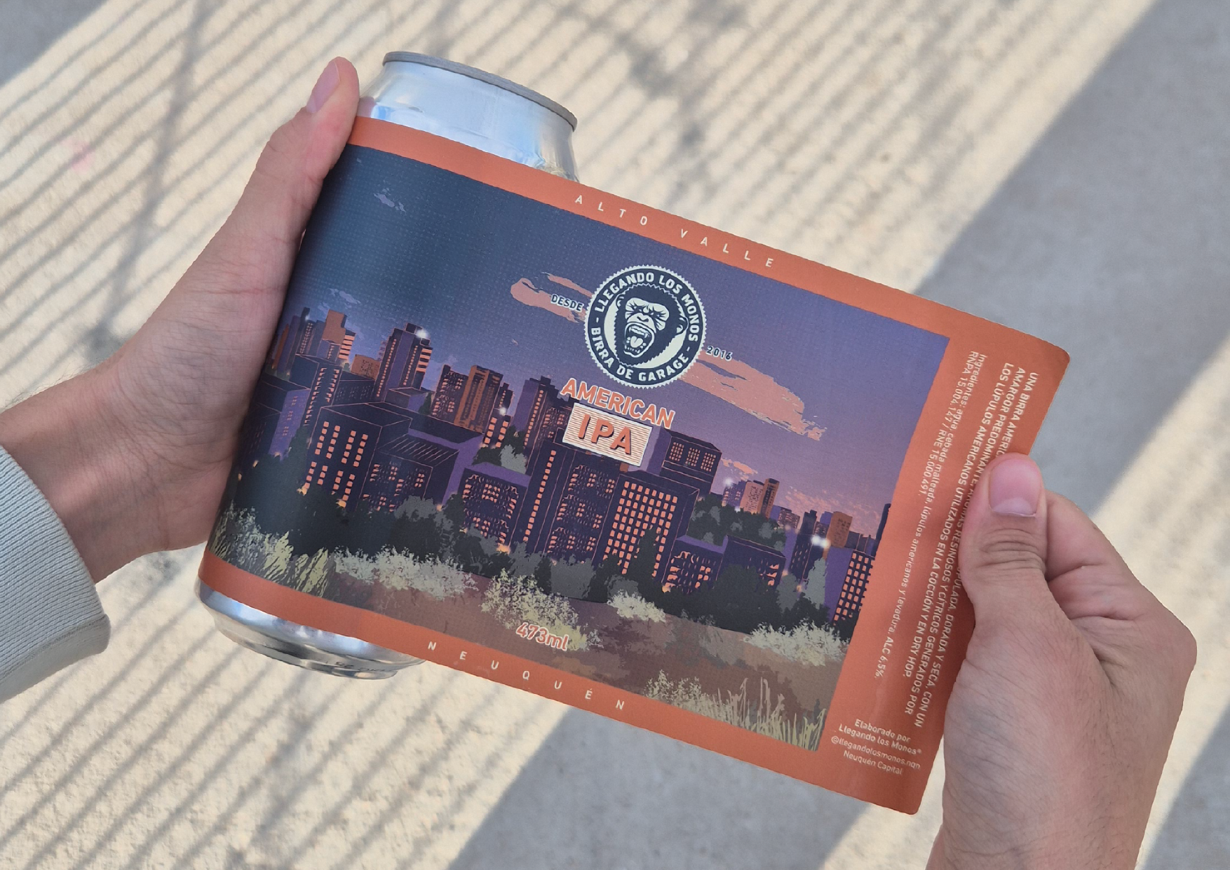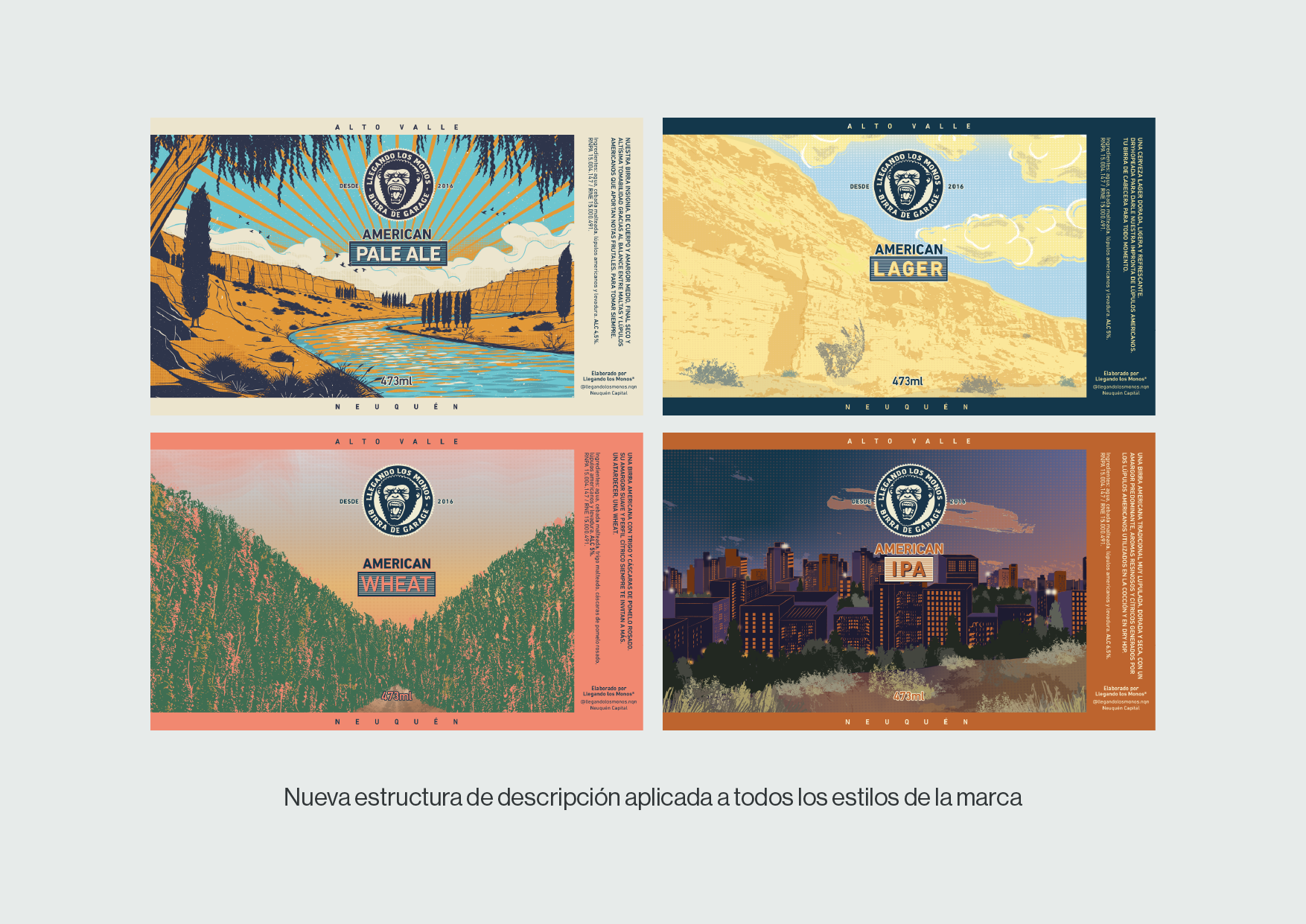 Continuando con la serie de paisajes neuquinos para las etiquetas de Llegando los Monos®, en el caso de la American Ipa se pensó en un escenario nocturno o transicionando a. Se buscó que el naranja (uno de sus colores marcarios) sea color predominante. En contraposición, el clásico azul de los monos.