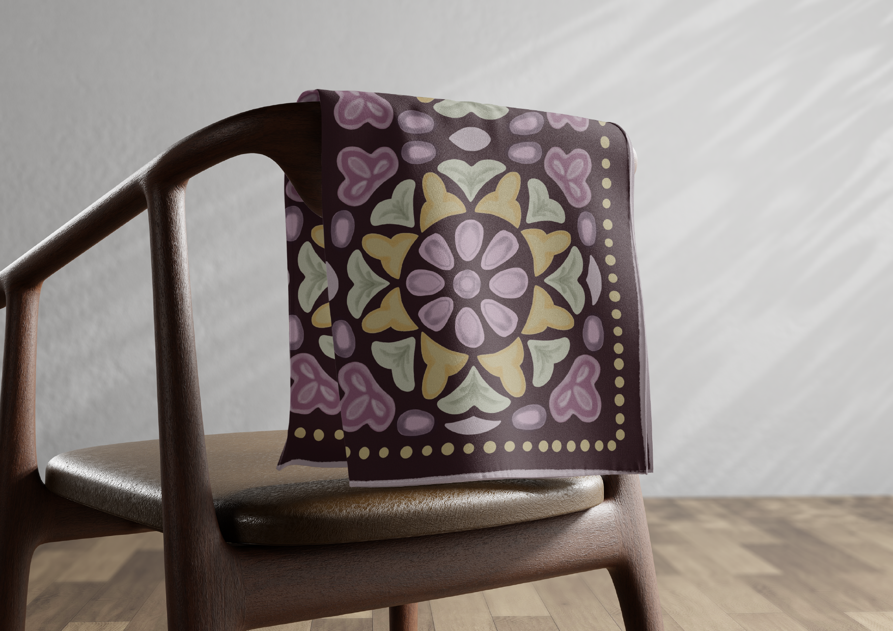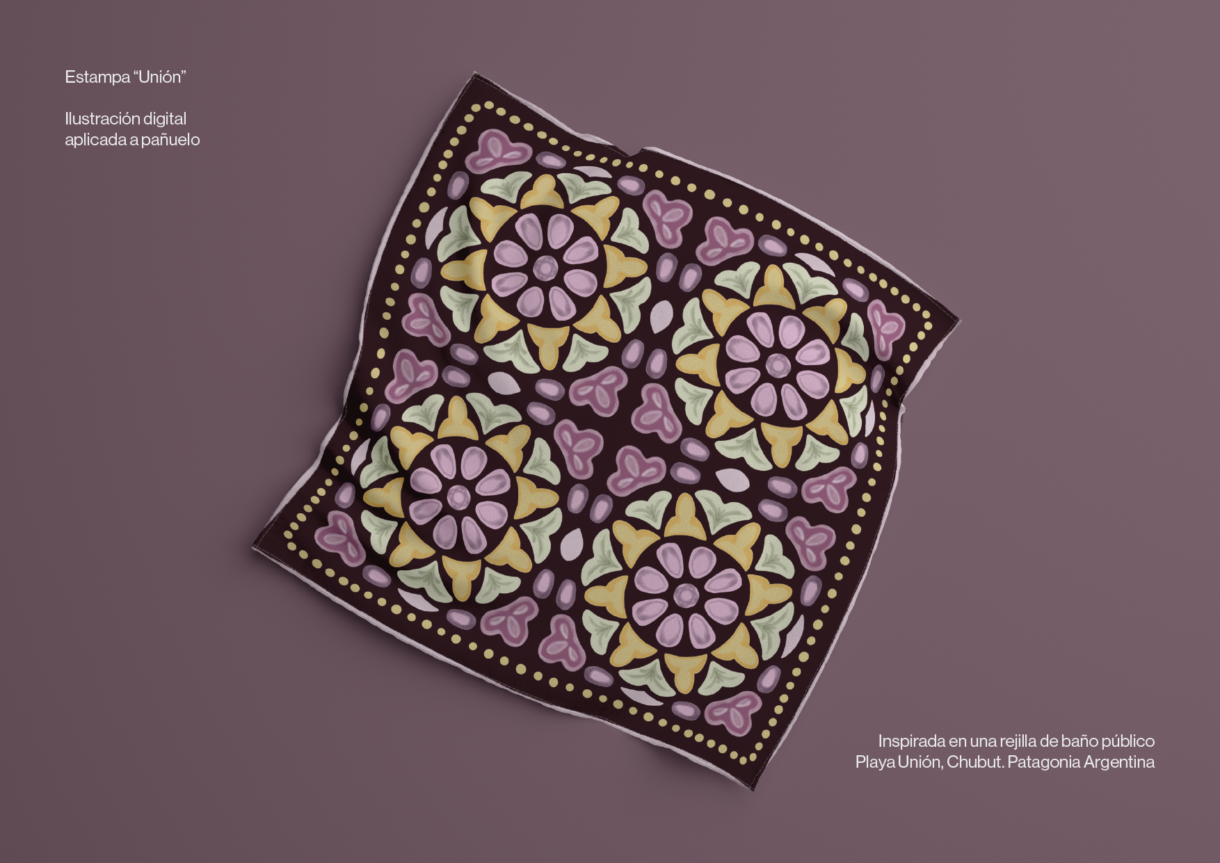 Ilustración pensada para un pañuelo inspirada en una rejilla del baño público en Playa Unión, Chubut. El diseño geométrico pero con formas orgánicas era digno de destacar y creamos este proyecto ficticio.